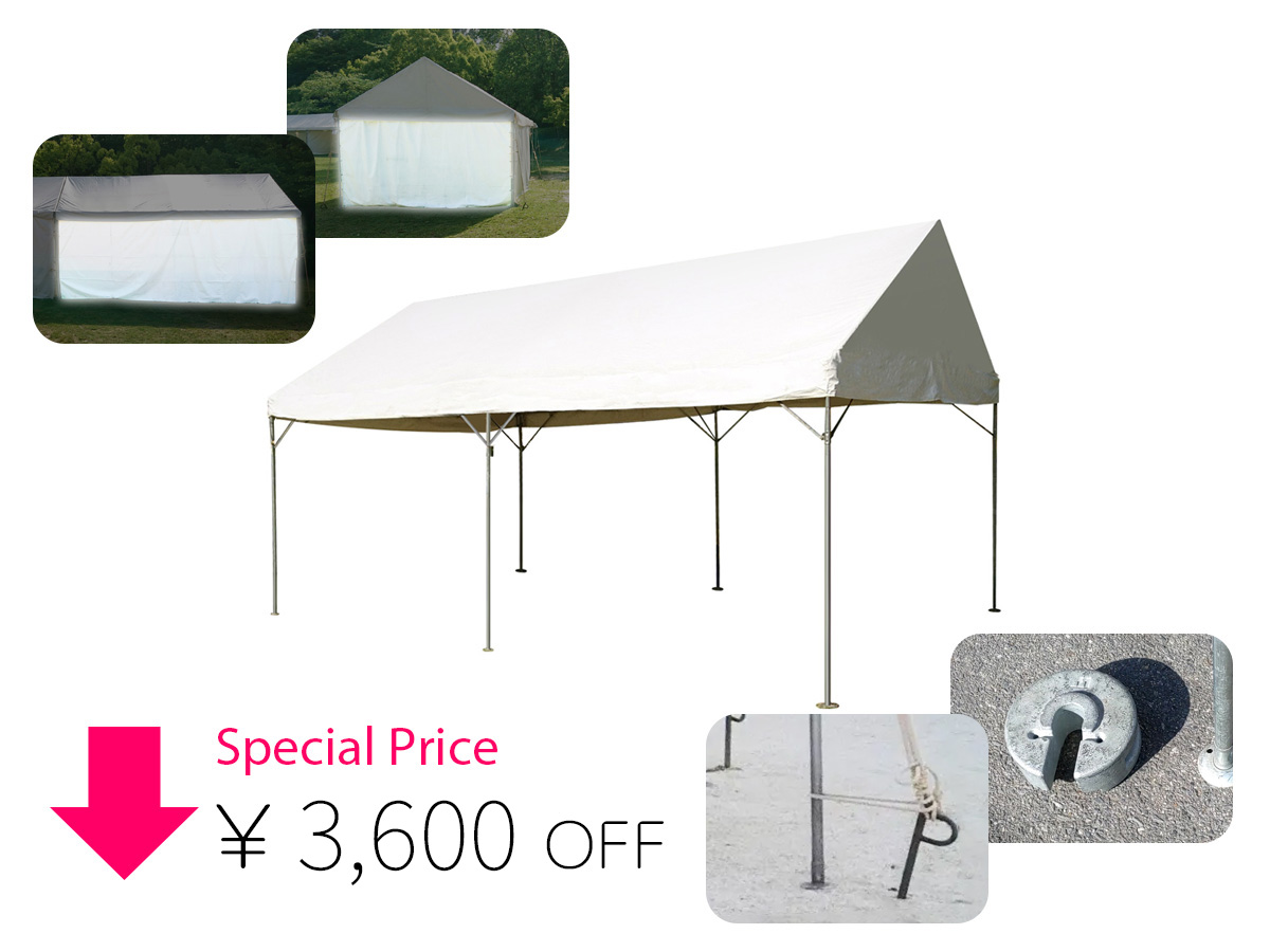 | セット内容 | 2×3間パイプテント(白)×1 20kgウエイト or 杭・ロープセット×6 2間横幕(白)×2 3間横幕(白)×2 |